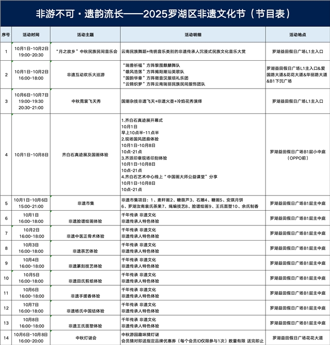 10月1日至8日,非游不可·遗韵流长——2025罗湖区非遗文化节将在罗湖益田假日广场盛大开启,以文化为媒,以商圈为舞台,邀你在诗意与烟火气中,感受传统非遗的鲜活魅力。此次活动由罗湖区委宣传部指导,区文明办、区文联主办,区城市管理和综合执法局、区商务局、区民协、罗湖益田假日广场、齐白石借山画馆协办。