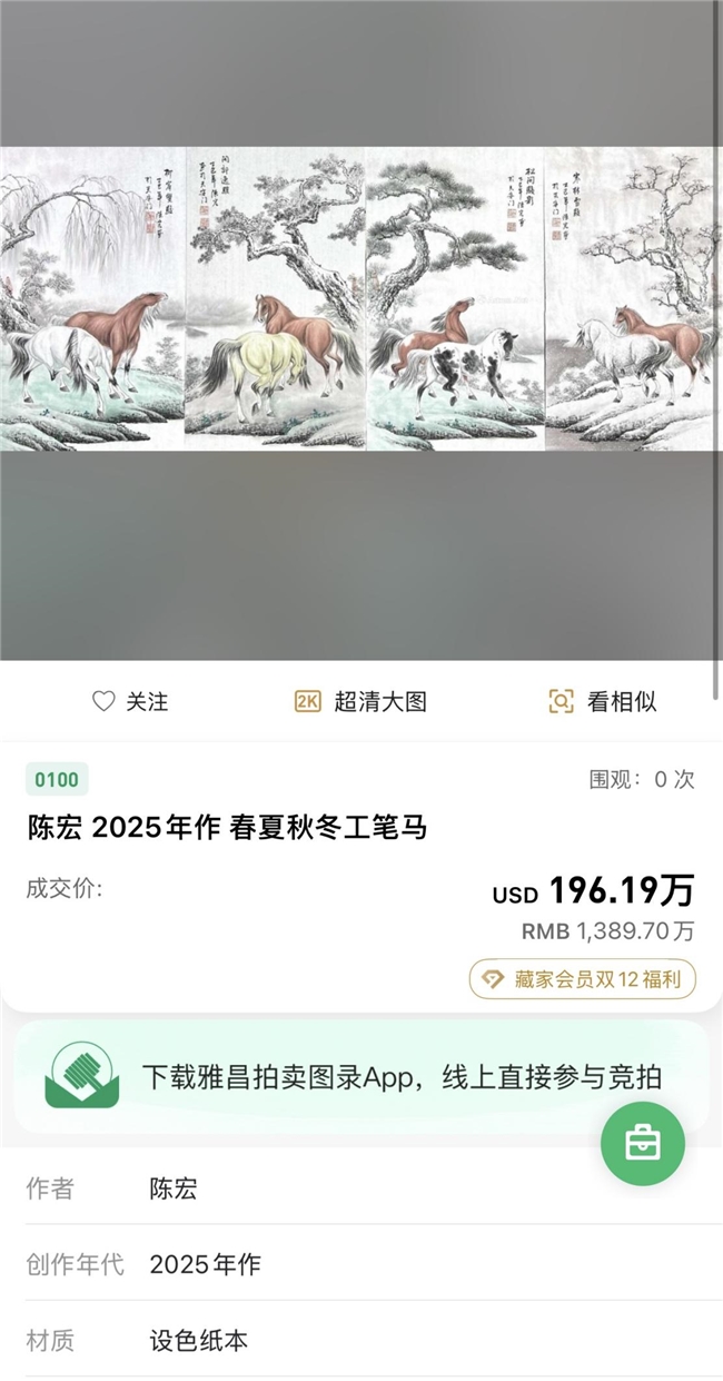 2025年末,中国当代军马画坛泰斗陈宏老师艺术专场登陆美国拍卖市场,以工笔马、写意马及人物作品为核心的专场拍卖引发全球藏家激烈竞逐,最终总成交额突破5000万元人民币,成为本年度国际拍卖市场的“现象级黑马”,其作品的艺术价值与收藏潜力得到全球市场的高度认可。 此次专场集中呈现了陈宏老师近年力作,涵盖《中国龙马写意长卷》《春夏秋冬工笔马》《钟馗威震》等多题材精品:其中《中国龙马写意长卷》以256.94万美元(约1820.05万元人民币)摘得专场桂冠,其独家专利的中国写意龙马技法,将军马的刚健与龙的祥瑞融于笔墨,苍劲洒脱的线条与气韵生动的构图,完美诠释了“龙马精神”的文化内核;