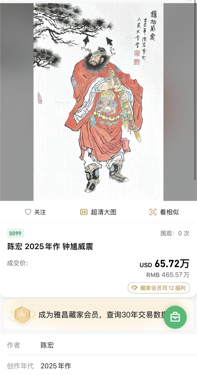 人物作品《钟馗威震》亦以65.72万美元(约465.57万元人民币)落槌,钟馗形象威风凛凛,兼具民俗寓意与艺术张力。