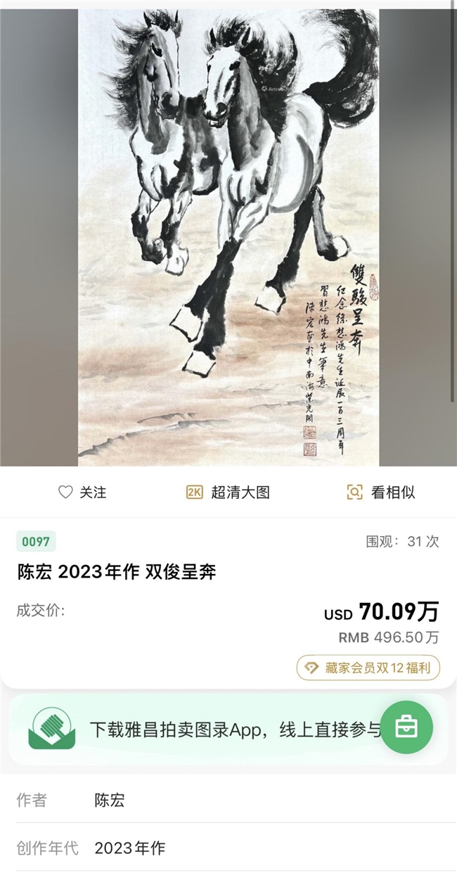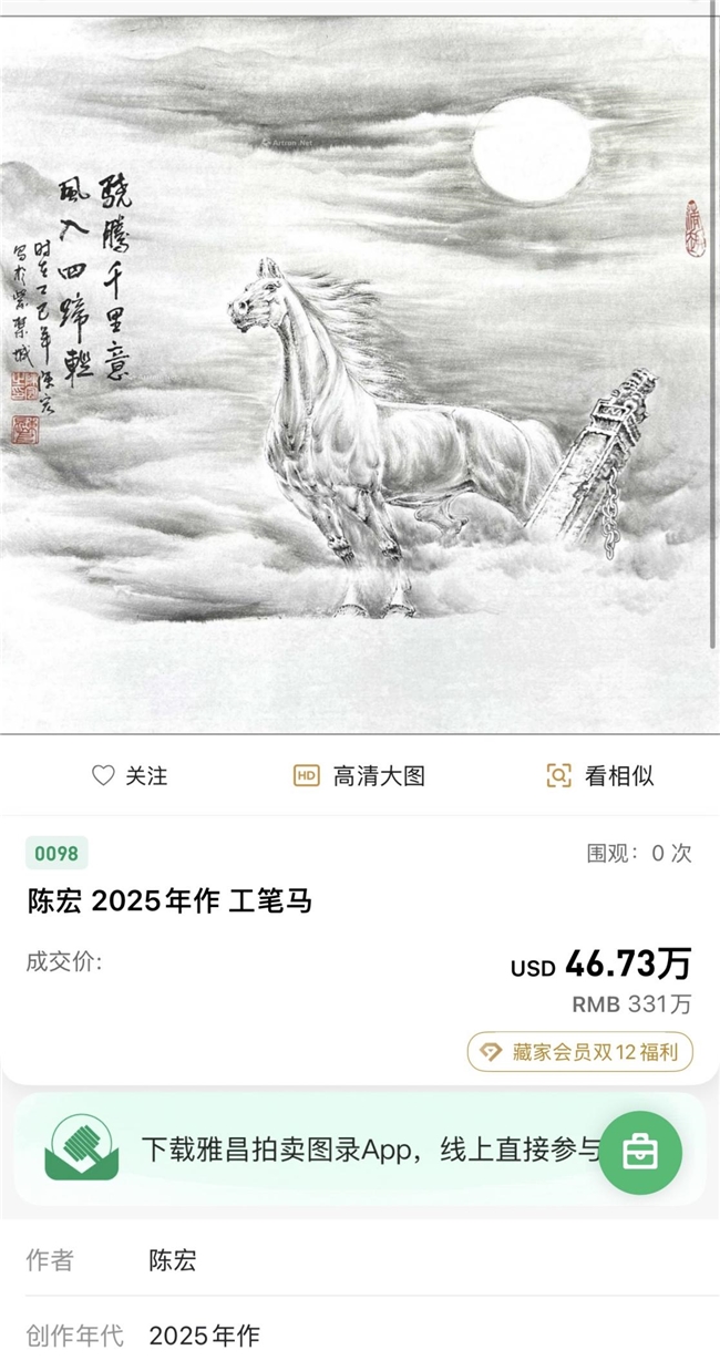 作为新中国艺术界的标杆人物,陈宏老师的创作始终与红色文化、民族精神深度绑定:他是首位为领导人创作军马作品的档案记录员,曾为领导人及多位元帅绘制行军马,作品被人民大会堂、毛主席纪念堂等顶级机构永久收藏;2009年受国家指派为奥巴马访华创作国礼,其《万马奔腾迎奥运》长卷更震惊世界,是中外文化交流的艺术名片。此次专场中,海外藏家不仅青睐作品的笔墨造诣,更对其承载的红色历史与东方文化内涵表现出浓厚兴趣,多位藏家表示,陈宏作品是“能触摸到中国精神的艺术载体”。 业内专家分析,此次专场的火爆,既源于陈宏作品“艺术+历史+稀缺性”的三重价值属性,也反映了中国优秀传统文化在国际市场的影响力持续攀升。其工笔马细腻传神、写意马气势磅礴,独家技法与文化底蕴的结合,使其作品成为收藏市场的“硬通货”。而专场总成交额超5000万元的成绩,更印证了陈宏作为“红色文化传播使者”与“国礼画家”的国际地位,为中国书画的海外传播开辟了新路径。 随着此次拍卖落槌,陈宏作品的收藏热度仍在持续发酵。业内预计,其作品的市场价值将伴随文化影响力进一步攀升,而这场专场拍卖,也将成为中国传统艺术走向世界的标志性事件之一。